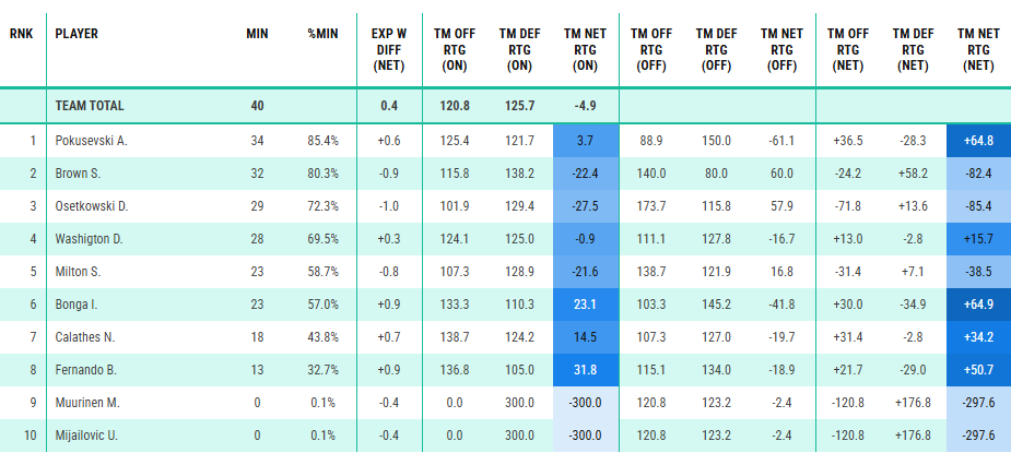 Dobar dan, pred vama je ON/OFF rating posle Partizanove utakmice protiv Asvela u gostima. Napomena, Partizan je na utakmici imao 72 poseda pa se grubo može izračunati koji je rezultat bio sa nekim igračem na terenu 72*(%min)(off rtg V def rtg).